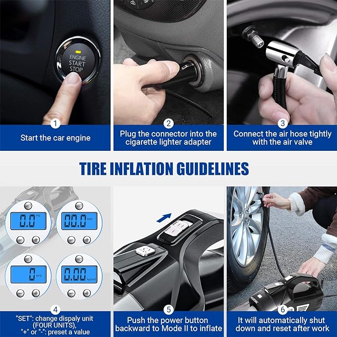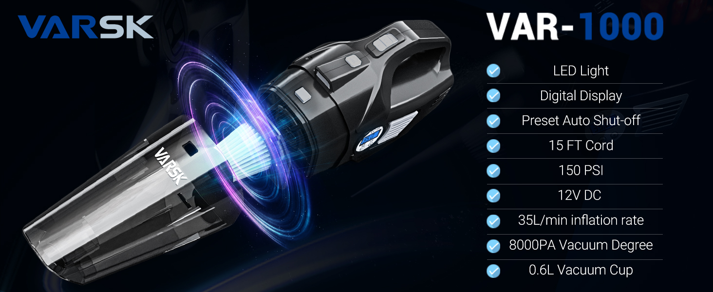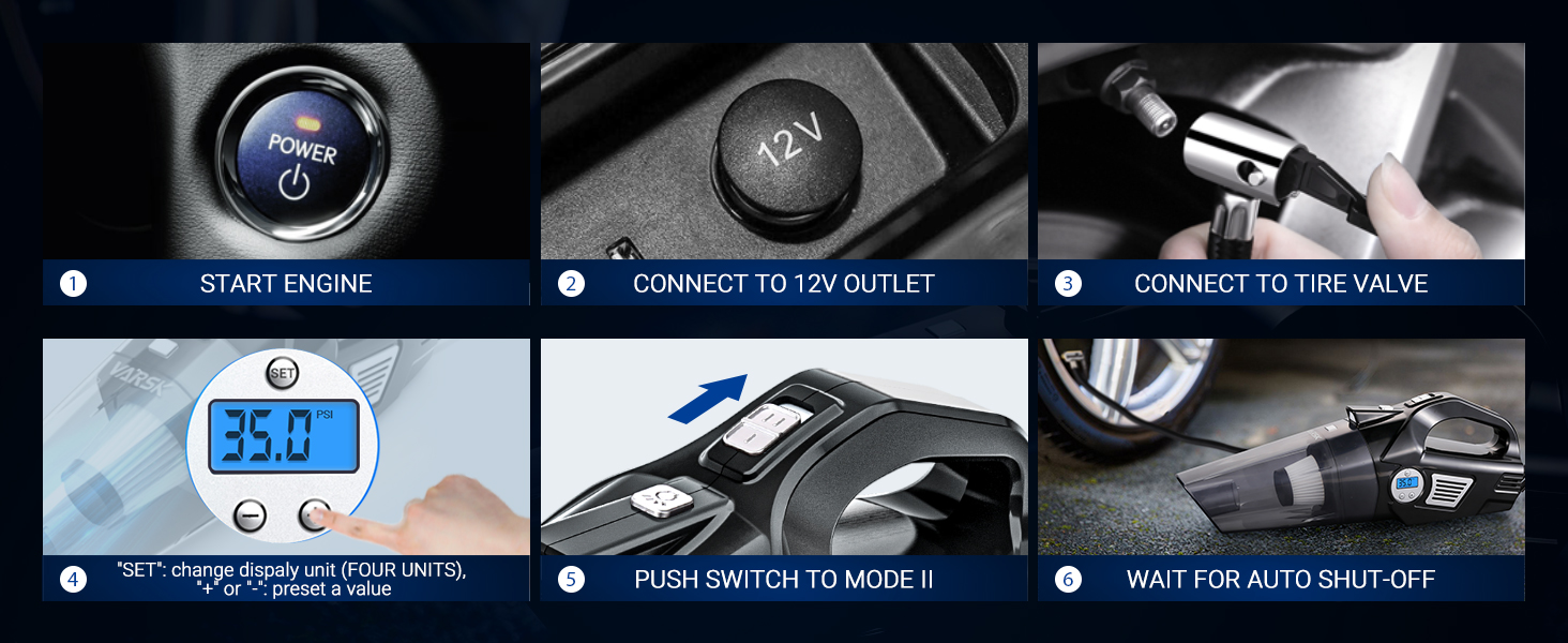 لطفا توجه داشته باشید که این بادکننده لاستیک قابل حمل کمپرسور هوا VARSK برای خودروهای سایز معمولی طراحی شده است. برای RV، ATV، کامیون و سایر وسایل نقلیه بزرگ با لاستیک های فشار قوی مناسب نیست. لطفاً قبل از هر بار استفاده حتماً فندک DC 12 ولتی را که در خودرو قرار دارد وصل کنید، و باید موتور خودرو را روشن کنید.